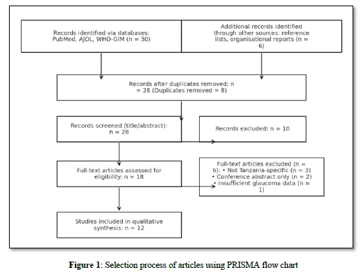We systematically searched PubMed/MEDLINE, African Journals Online (AJOL), WHO Global Index Medicus (GIM), and Google Scholar up to September 1, 2025. The search combined MeSH and free-text terms: “glaucoma” OR “primary open-angle glaucoma” OR “ocular hypertension” AND “Tanzania”. No language restrictions were applied, though all identified articles were in English. To supplement database findings, we also hand-searched reference lists of relevant articles and organizational reports (e.g., Tanzanian ophthalmology society reports, WHO Africa regional publications).