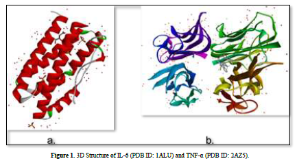 The 3D structures of the IL-6 protein (PDB ID: 1ALU) and TNF-α protein (PDB ID: 2AZ5) were gotten from the Protein Data Bank (PDB) website (www.rcsb.org) in .pdb format (Figure 2). The preparation of protein involves the separation of water molecules and native ligand using BIOVIA Discovery Studio Visualizer software. Subsequently, the protein is optimized using the AutoDockTools software to add polar hydrogen atoms and kollman charge, and then saved in. pdbqt format.
