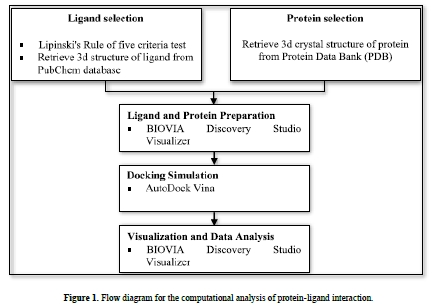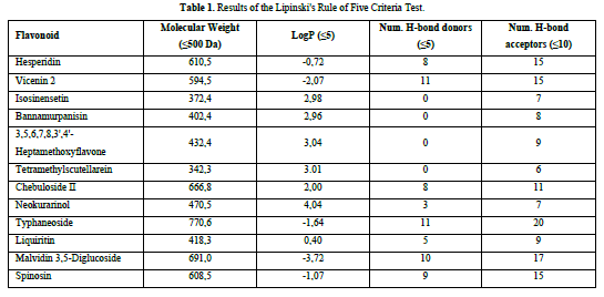 The flavonoid compounds to be used as ligands in this research will undergo the Lipinski's Rule of five criteria test. The criteria include a molecular weight ≤ 500 Da, a LogP value ≤ 5, the number of hydrogen bond donors ≤ 5, and the number of hydrogen bond acceptors ≤ 10. The Lipinski's Rule of Five criterion test can be conducted by extracting the simplified molecular input line entry system (SMILES) code of the required chemicals from the PubChem website (https://pubchem.ncbi.nlm.nih.gov/) and afterwards inputting it into the Swiss-ADME website (http://www.swissadme.ch/).