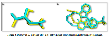 The observed parameter is the root mean square deviation (RMSD) value obtained after redocking the native ligand with the protein. The RMSD value is a parameter that indicates the extent of deviation of the native ligand before and after redocking [15]. The validation process of the IL-6 protein at grid center x = -7.677, center y = -12.743, and center z = 0.007 with dimensions 26x26x26 resulted in a root mean square deviation (RMSD) value of 1.115 Å. Meanwhile, the validation process of the TNF-α protein at grid center x = -19.163, center y = -74.451, and center z = 33.837 with dimensions 26x26x26 resulted in an RMSD value of 1.458 Å. These results can be deemed valid as the RMSD values obtained after the redocking process are ≤ 2˚Å [11]. Therefore, the same dimensions and grid box coordinates can be used for the docking process with the test ligands. Figure 3 shows the overlay of the native ligands of IL-6 and TNF-α before and after the redocking process.