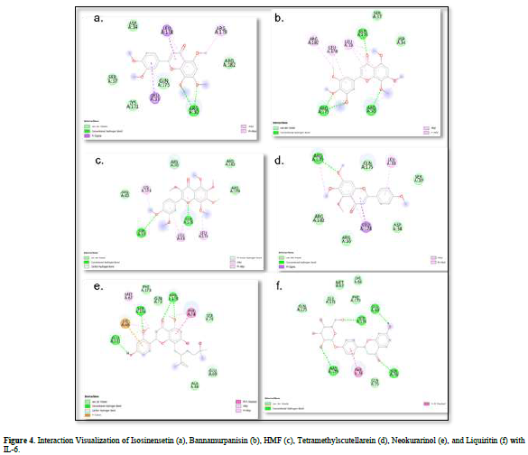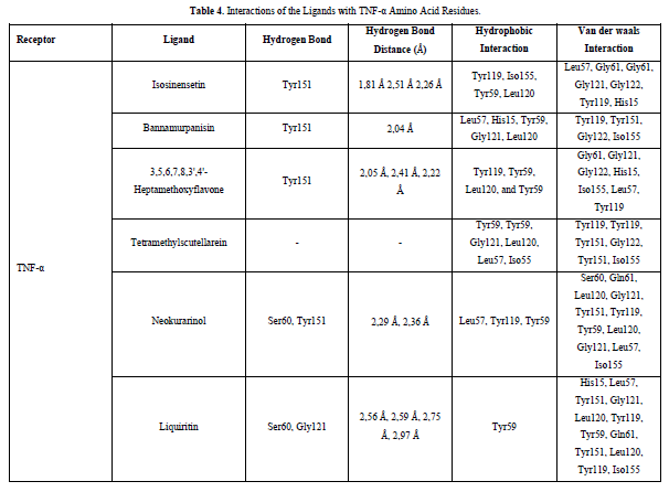 The docking results show that isosinensetin, bannamurpanisin, HMF, tetramethylscutellarein, neokurarinol, and liquiritin can spontaneously bind to both IL-6 and TNF-α. The results also indicate that liquiritin has better potential in inhibiting IL-6 and TNF-α compared to other compounds (Table 2). The interactions of the test ligands with IL-6 form bonds with amino acid residues such as Arg179, Arg182, and Gln175. This finding is in line with previous studies reported by Azzahra (2021) (2021) dand Wang (2019) (2019) [17,18] which state that the 3D crystal structure of IL-6 with PDB ID 1ALU has active sites at amino acid residues Arg179, Arg182, and Gln175. On the other hand, the interactions of the test ligands with TNF-α form bonds with amino acid residues Leu57, Tyr59, Ser60, Gln61, Tyr119, Leu120, Gly121, Gly122, and Tyr151. This finding is consistent with research conducted by Zia (2020) and Yende (2021) [19,20] indicating that the 3D crystal structure of TNF-α with PDB ID 2AZ5 contains an active site on the amino acid residues Leu57, Tyr59, Ser60, Gln61, Tyr119, Leu120, Gly121, Gly122, and Tyr151. The findings of this study suggest that isosinensetin, bannamurpanisin, and HMF have the potential as candidate inhibitors of IL-6 and TNF-α.