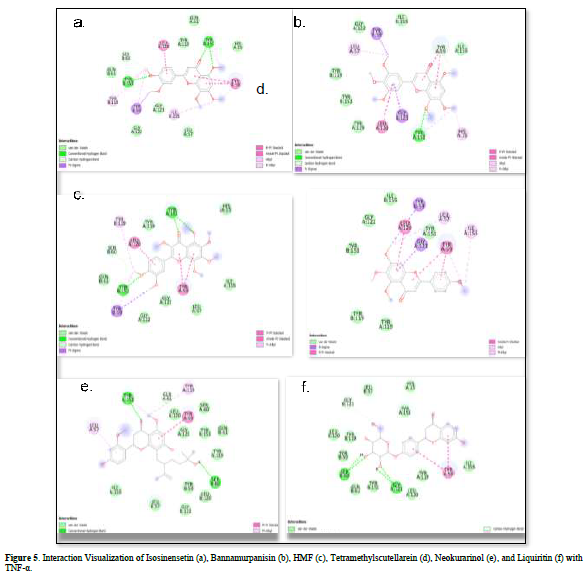 Referring to the interactions between ligand residues and TNF-α (Figure 5 & Table 4), liquiritin forms more hydrogen bonds and involves more amino acid residues in van der Waals interactions compared to other compounds, resulting in a lower ΔG value. The hydrophobic interactions that occur between bannamurpanisin and Tetramethylscutellarein with TNF-α tend to have a greater influence on the ΔG value compared to hydrogen bonding. This can be observed from the lower ΔG values of bannamurpanisin and Tetramethylscutellarein compared to HMF. Venugopal [29] stated that the more hydrophobic interactions formed, the more stable the ligand-receptor complex, leading to lower ΔG values. This stability is due to hydrophobic interactions enabling the protein to reduce the surface area and minimize unwanted interactions with water molecules [30]. However, it should be understood that there are factors influencing ΔG value that cannot be observed in molecular docking. To gain a more comprehensive understanding of the structure-function relationship of proteins and protein-ligand complexes, as well as the ΔG value, it is important to conduct further in-depth analysis and verification with other methods, such as molecular dynamics [31].