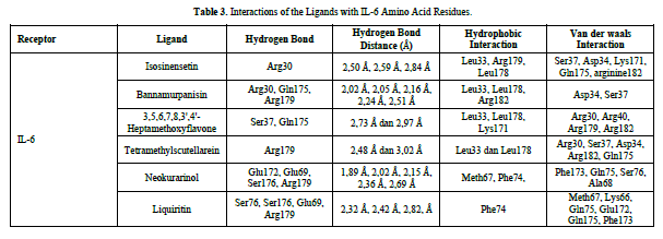 Based on the residue-ligand interactions that occur between the test ligands and IL-6 (Figure 4 & Table 3), although the number and length of hydrogen bonds formed are not greater, liquiritin produces a lower ΔG value compared to other compounds. This is because more amino acid residues are involved in the interactions with liquiritin, and the more residues involved in the interaction with the ligand, the stronger the bond formed between the ligand and the receptor [28]. Additionally, liquiritin also shows more van der Waals interactions, which allow it to form more bonds compared to other compounds.