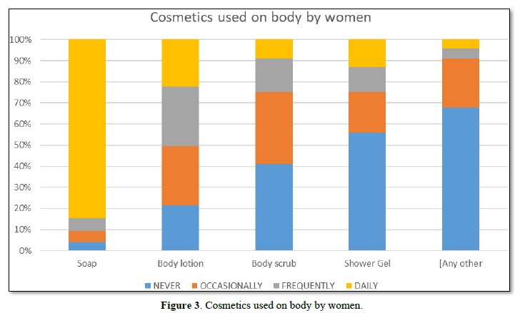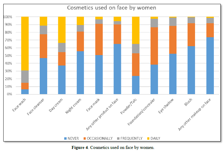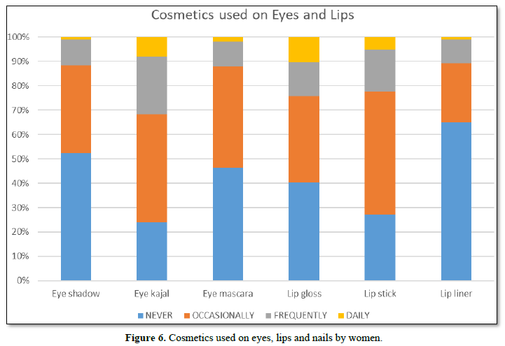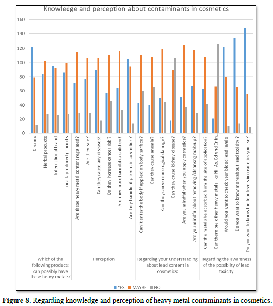 Cosmetics and daily personal care products are in use for centuries and they have evolved in many ways. They are universally used by both genders. There have been reports of heavy metals as contaminants from several countries and in varied quantities [1,3,7-11,18-20]. The objective of our study was to assess the knowledge about contaminants in cosmetics, the common practices and to create awareness among young women. Our study population were young, educated, brand conscious and confident as a small group (1.9-3.3%) had concerns about their appearance (Figure 1). Majority of them used personal care products like soaps and face washes on daily basis and occasionally used products on lips, eyes and nails. Majority (about 50%) of women in our study doubted the possibility of contaminants in the products they used. It was difficult to assess whether they had the knowledge or through our questionnaire we were able to induce suspicion. Later in the questionnaire, when there were questions about whether they would want to know more about toxicity with heavy metal contaminants and whether they would want to know the levels of contaminants in their blood and cosmetic products, there was an assertive ‘yes’ by majority of them. Only 9 to 14 of them out of 214 women did not want to check the above (Figure 8). There is a need for creating awareness among both the manufacturing companies, the consumers and the policy makers about the health implications these heavy metals can cause. In the USA, though there is a ban in import of leaded eye cosmetics, there is no effective method to prevent lead exposure to children [14]. It was reported that even the herbs and plants gathered from different localities had toxic levels of lead more than commercially available products [21]. It was attributed to the levels in soil where the plants were grown. In India, the major sources of Pb was from herbal products and cosmetics [22]. With prolonged exposure to minute quantities of heavy metals, they tend to accumulate in the body and cause an imbalance in the normal free radical generation and signal transduction. Both epidemiological and laboratory data suggest that heavy metal induced oxidative stress damage are linked with increased risk of cancer, renal failure, developmental, behavioral and neurological disorders and certain high prevalent non-communicable diseases like diabetes mellitus, infertility, and cardiovascular disease [23]. As the mean age at which they start the use of cosmetics in our study group was very young (11.9 years), there is a likelihood of sequestration of large quantities of harmful heavy metals in the body which will not only affect that person using but also the next generation [19,24]. The heavy metals sequestered in bones may be mobilized to blood in an increased manner due to iron and calcium deficiency, fractures and any kind of stress including pregnancy [25]. As the development of brain occurs most during the neuronal development in utero, it is of utmost need to educate women so that the next generation is not affected by neurological and behavioral disabilities [26]. Lack of awareness can pose an outsized risk to public health and affect other aspects like quality of life, efficiency and productivity of the population at large. The exquisiteness about contaminants in cosmetics generated during this study has led us to suggest newer avenues for exploration and research. Some of which are: consumer education and awareness, regulatory concerns, safer product development and its testing, alternate formulations for cosmetics and long-term health implications.