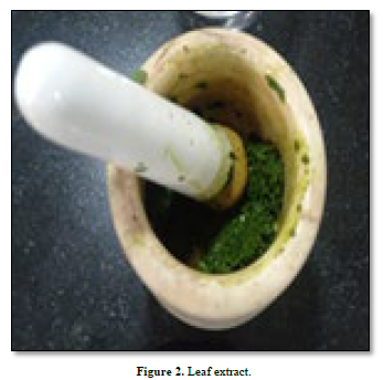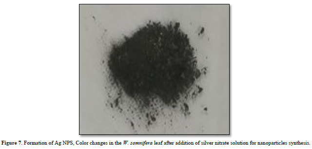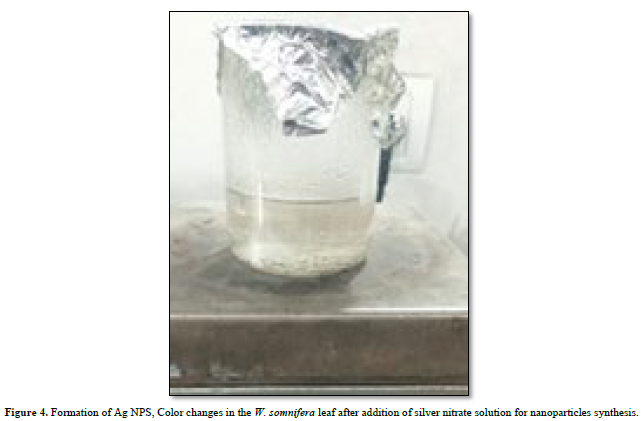 Fresh leaves of Withania somnifera were collected from Dr. Babasaheb Ambedkar Matathwada University, Botanical garden Aurangabad (Figures 1 & 2). The fresh leaf of Withania somnifera extract was prepared by taking 10 gm of thoroughly washed and finely cut leaves in 250 ml conical flask along with 100 ml of sterilized glass distilled water and then boiling mixture for 5 min before finally decanting it. At room temperature (Figure 3), 5 mM aqueous silver nitrate solution was added (Figure 4). The extract was filtered through Whatman’s filter paper No. 01. This filtered extract was stored at 4°C in the refrigerator for further studies and analysis.