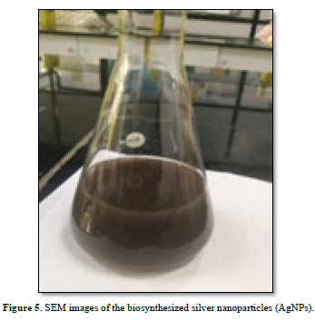 In the present investigation, these AgNPs were synthesized by using aqueous leaves extracts of Withania somnifera by incubating with silver nitrate. A color change of the medium from faint to dark brown color was developed by the addition of silver nitrate. The appearances of dark brown Color indicated the presence of SNP (Figure 5).