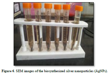 Scanning Electron Microscopy was performed to confirm the development of silver nanostructure. The control sample shows high density silver nanoparticles of Withania somnifera (Figure 8). SEM micrograph analysis finally revealed the synthesis of silver nanoparticles in the reaction mixture. At room temperature, the addition of 5 mM aqueous silver nitrate solution to the leaf extract resulted in the precipitation of nanoparticle. These precipitates are analyzed under microscopic studies for the nanoparticles surface morphology. SEM analysis aqueous leaf extract exhibited spherical and cubical shape. It also observed that silver nanoparticles found with different sizes of the particles. It is concluded from the SEM pictures that silver nanoparticles in the bio reduced colloidal suspensions was measured 59-110 nm in size. The morphology of the nanoparticles was spherical and cubical (Figure 8).