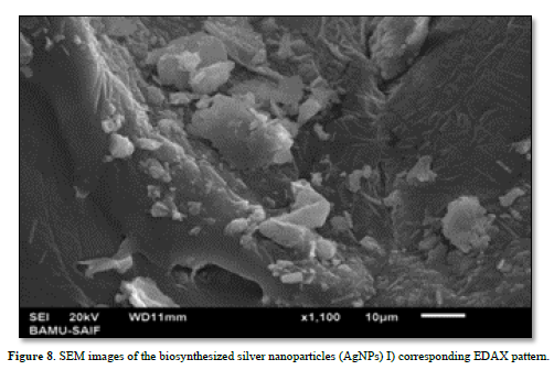 Scanning Electron microscopy (SEM) and EDAX analysis was done by using (SU8010, Hitachi) machine, used to characterize the shape of AgNPs. On the carbon-coated copper grid, a thin film of the dried samples was made by simply placing a little sample followed by drying for 10 min in the presence of mercury lamp. A Field-Emission Scanning Electron Microscope (FESEM) images were used to study the size and morphology of AgNPs