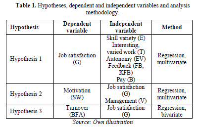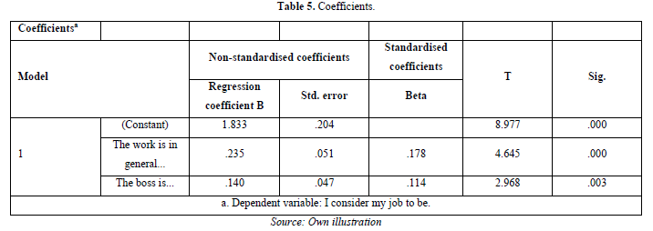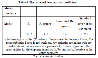 Table 3 shows that the corrected determination coefficient R2=0.332 means that job satisfaction can be explained statistically by the key factors at a rate of 33%.