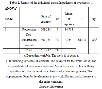 As was the case for hypothesis 1, the differences between the public pharmacist and the non-public pharmacist hypotheses are analysed. Table 6 shows that this parameter plays a significant role in hypothesis 2: p=0.034 < 0.05. As the coefficient (b=-0,184) of the regression is negative, it can be stated that the dependent variable motivation is lower for the non-public pharmacists.