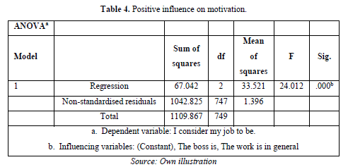 Lastly, Table 5 shows that the corrected determination coefficient R2 = 0.058 indicates that motivation can be explained statistically by job satisfaction and management at a rate of 6%.