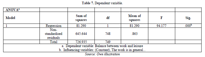 The ANOVA table shows that the F-test is significant: F(1.748)=94.177, p < 0.01. This means that the model is significant overall. Table 7 shows the results of the individual partial hypotheses of hypothesis 3.
