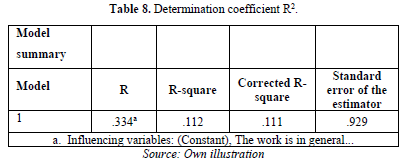 Lastly, Table 8 shows that the corrected determination coefficient R2=0.112 means that turnover can be explained statistically, or in other words reduced, by job satisfaction at a rate of 11%.