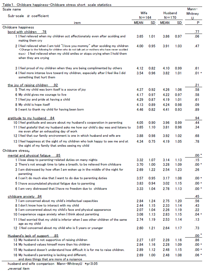This study reports the results of the analysis of childcare happiness and stress and husband’s parenting behaviors (50 childcare items), which were unpublished owing to the limitation of the character count of a previously published article [7].