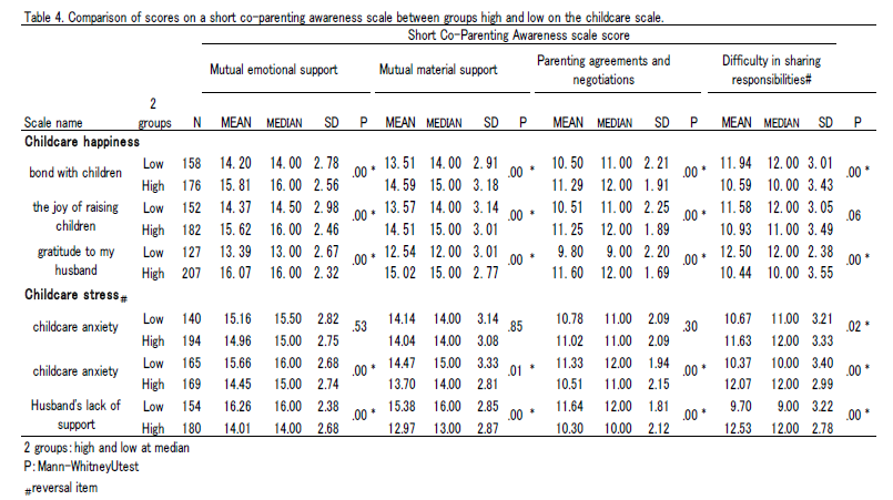 Regarding the relationship with the Short Co-parenting Awareness Scale, high scores for childcare happiness and low scores for childcare stress were associated with high “Mutual emotional support,” “Mutual material support,” and “Parenting agreements and negotiations” and low “Difficulty in sharing responsibilities.”