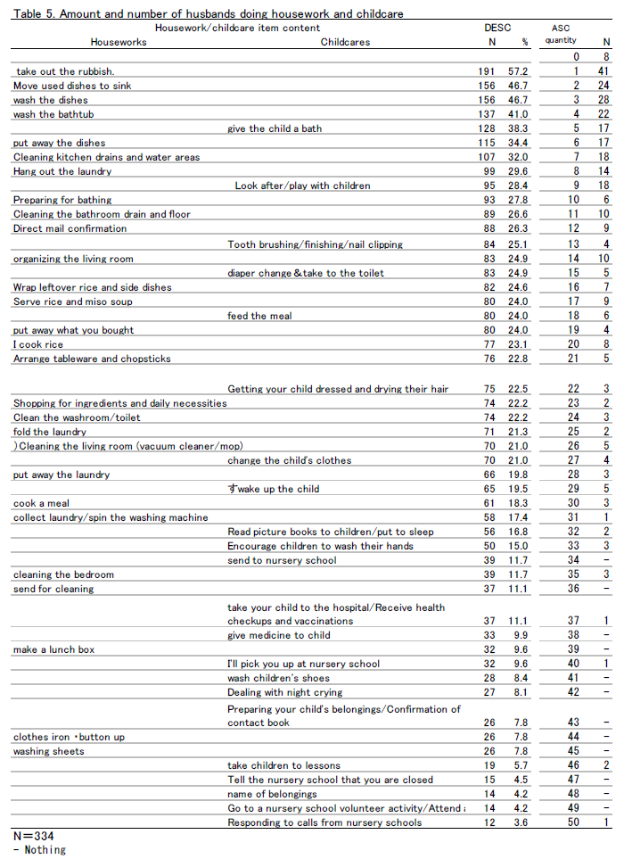 If wives performed 50 of the items in housework and childcare list, husbands performed 1/5th of them, more than half of the husbands performed only 1 item, and only one husband performed all 50 items. Hence, it is difficult to interpret these statistics.