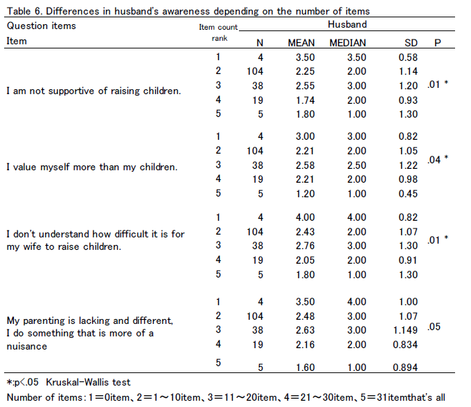 The husbands’ household chores and parenting behaviors are interpreted as their cooperation and were considered to be associated with the Short Co-parenting Awareness Scale. Therefore, the significance probabilities were “Mutual emotional support,” p = 0.53; “Mutual material support,” p = 0.58; “Parenting agreements and negotiations,” p = 0.12; and “Difficulty in sharing responsibilities,” p = 0.18. These probabilities were based on the comparison of the five categories of the number of items of the four subscales for the husbands Short Co-parenting Awareness Scale. There was no significant difference in the subscale scores by number of items (quantity). Furthermore, we focused on one item from “husband’s lack of support,” i.e., “I am not supportive of raising children,” and compared the five categories of four items of husband’s lack of support as the number of childcare items. We found significant differences in the three items of “I am not supportive of raising children” (p = 0.012), “I value myself more than my children” (p = 0.035), and “I don’t understand how difficult it is for my wife to raise children” (p = 0.012) (Table 6).