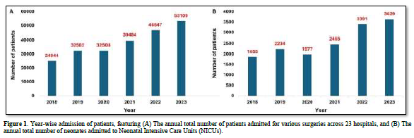 Over the period from 2008 to 2023, surgeries were performed on a total of 2,29,094 patients across various hospitals. Additionally, 15,541 neonates were admitted to the NICUs. Figure 1 illustrates the year-wise admissions of patients from 2018 to 2023 undergoing surgeries and those admitted to NICUs.