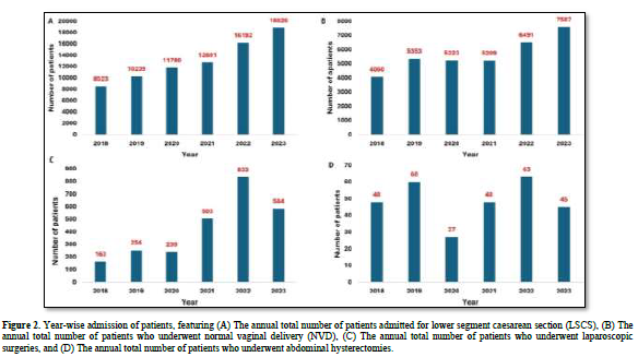 Moreover, 78,251 patients underwent LSCS, while 33,923 had experienced normal vaginal delivery (NVD). Among females admitted for various surgeries, 2,576 underwent laparoscopic surgeries, and 291 underwent abdominal hysterectomies.