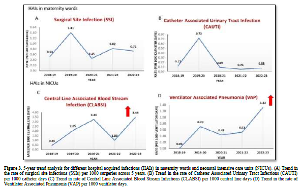 The study identified the highest yearly average incidence rates for these HAIs as follows: 0.8/100 surgeries (2021-2022) for SSIs, 0.7 per 1000 ventilator days (2019-2020) for VAP, 3.2 per 1000 central line days (2020-2021) for CLABSI, and 0.7 per 1000 catheters days (2019-2020) for CAUTI. The 5-year trend from 2018 to 2023 for different HAIs in maternity ward and NICU is depicted in Figure 3.