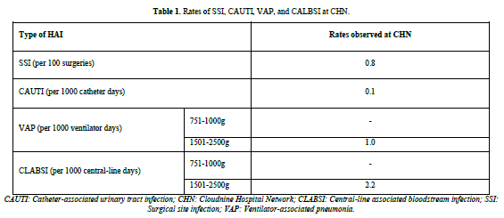 According to World Health Organization (WHO), Hospital-acquired infections (HAIs), previously known as nosocomial infections (NIs), refer an infection contracted by a patient who was admitted for a condition unrelated to the infection itself. It encompasses infections that manifest in patients within a hospital or another healthcare facility (HCF), even if the infection was not present or in its early stages at the time of admission. This definition extends to infections acquired during the hospital stay but becoming apparent after discharge. Additionally, it encompasses infections contracted by the staff of the facility as part of their occupational exposure [1,2]. Typically, these infections manifest within 48-72 h of hospitalization or within 10 days following discharge [3]. The worldwide HAI prevalence is reported at 0.14%, with a gradual annual increase of 0.06% [4]. In developing countries like India, HAIs are a major challenge for patients [5]. Compared to HAI rates of 4.5 to 7.1 per 100 patients in the Western world, low and middle-income countries (LMICs) face a higher prevalence of 15.5 per 100 patients. Low middle-income countries also see a threefold increase in HAI rates within Intensive Care Units (ICUs) compared to developed nations [5,6]. The World Health Organization (WHO) states that 1 in 10 patients affected by HAIs succumbs to the infection, but effective infection prevention and control (IPC) programs can reduce HAIs by almost 70% [2]. However, there are significant knowledge gaps regarding IPC implementation in neonatal care [7]. Moreover, a recent study presents proof of inadequate compliance with IPC in maternal wards stemming from insufficient documentation or the 'invisibility' of HAIs, low prioritization of IPC tasks, absence of IPC goals and resources, discretionary application of guidelines, and challenges related to communication [8]. HAIs are a significant global health threat, especially in critical care units, causing increased mortality, morbidity, and financial burdens on communities [9,10]. The Centers for Disease Control and Prevention (CDC) broadly categorizes types of HAIs as central line-associated bloodstream infections (CLABSI), catheter-associated urinary tract infections (CAUTI), surgical site infections (SSI), and ventilator-associated pneumonia (VAP) [10,11]. Each type of HAI has specific risk factors and preventive measures to reduce their occurrence. HAIs in neonatal care pose a significant challenge, leading to morbidity, mortality, prolonged hospitalizations, heightened risk of severe neurodevelopmental disorders (especially in premature infants), and increased medical costs [12,13]. The incidence of HAIs in neonates is about 7.5 times higher than in adults [2]. In India, many studies show a high incidence of neonatal bloodstream infections, often linked to preterm labor [14,15]. Recent research emphasizes that factors like low birth weight (LBW), prematurity, hospital stay duration, central venous catheter usage, and mechanical ventilation are significantly associated with higher rates of HAIs in neonatal intensive care units (NICUs) [16]. Similarly, a study has reported barriers to effective IPC in maternity wards to be the efficacy of training, insufficient accessibility to personal protective equipment, inadequate adherence to hand hygiene practices, and outdated procedures for reprocessing reusable medical equipment [17]. Furthermore, the occurrence of HAIs in hospitalized neonates presents a multifaceted challenge, stemming from the potential transmission of microorganisms among patients through healthcare workers (HCWs) and caregivers, such as parents and family members. Additionally, contamination of the hospital environment and equipment contributes to the spread of infections [7]. Some of the maternal factors that can predispose neonates to infections are premature rupture of membranes, maternal fever within two weeks prior to delivery, meconium-stained amniotic fluid (MSAF), foul-smelling liquor, and instrumental delivery [18]. It has been reported that in many LMICs, most neonatal units may lack a formal monitoring mechanism or a systematic strategic response to contain HAIs [19]. To address these concerns effectively, it is essential to implement surveillance systems focused on endemic HAIs with standardized definitions and establish evidence-based best practices for IPC systems. With the promotion of institutional deliveries, there has been an increase in hospital births, exposing patients to the risk of HAIs. To mitigate adverse outcomes resulting from HAIs, it is crucial to establish, implement, and regularly audit IPC measures in clinical establishments [20]. This study aims to assess the existing evidence base and provide insights to inform future actions in reducing the incidence of HAIs using the Cloudnine Hospital Network (CHN; a chain of maternity, children’s, and fertility hospitals) as a prototype.