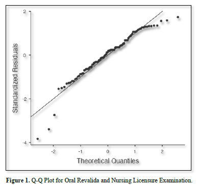 The scatter diagram provided is a Q-Q (quantile-quantile) plot, which is used to assess whether the residuals of a regression model follow a normal distribution. In the context of the study examining the relationship between participation in the oral Revalida program and performance in the Philippine Nursing Licensure Examination (PNLE), the interpretation of this Q-Q plot can provide insights into the assumptions of the linear regression analysis. The points in the plot closely follow the diagonal line, which suggests that the residuals are approximately normally distributed. This is a positive indication that the normality assumption for the residuals in the linear regression model is satisfied. There are a few points at the extremes (both ends of the plot) that deviate from the line. These deviations could indicate the presence of outliers in the residuals. However, minor deviations at the tails are often acceptable and do not necessarily indicate a significant violation of the normality assumption. In addition, the consistency of the points along the diagonal line also implies homoscedasticity, meaning the variance of the residuals is constant across different levels of the predicted values. This is another important assumption for linear regression models. In the study on the impact of the oral Revalida program on PNLE performance, ensuring that the residuals of the regression model are normally distributed and exhibit homoscedasticity is crucial for the validity of the regression results. Polit & Beck [6] emphasize that homoscedasticity is essential for the validity of the standard errors of the regression coefficients, which in turn affects the reliability of hypothesis tests and confidence intervals. Inconsistent variance (heteroscedasticity) can lead to biased estimates of the coefficients' standard errors, making statistical tests unreliable. The Q-Q plot provided supports the following conclusions: a) since the residuals are approximately normally distributed, the results of the linear regression model (such as the coefficients, standard errors, t-values, and p-values) are reliable. This strengthens the validity of the finding that participation in the oral Revalida program significantly affects PNLE performance. The adherence to the normality assumption implies that the confidence intervals and hypothesis tests conducted as part of the regression analysis are accurate. This means that the reported significance levels (p-values) for the predictors, such as the significant positive impact of the Revalida program on PNLE scores, are trustworthy. The homogeneity of variance (homoscedasticity) suggests that the model’s predictive power is stable across different levels of the predicted PNLE scores. This adds robustness to the model, indicating that it can reliably predict PNLE performance based on Revalida participation scores [17-19].