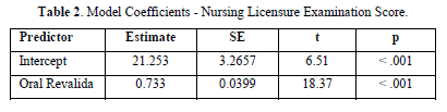 The journey from nursing education to professional practice involves a crucial evaluation of students' competencies through licensure examinations. In the Philippines, the Philippine Nursing Licensure Examination (PNLE) serves as the critical benchmark for nursing graduates, assessing their readiness to enter professional practice. Previous studies have underscored the importance of comprehensive preparatory programs in enhancing licensure examination performance. For instance, Borines & Adare-Tasiwoopa [1] emphasized that structured review programs significantly contribute to higher pass rates in nursing licensure examinations. Similarly, enhanced preparatory activities, such as simulated exams and targeted review sessions, have been linked to improved student outcomes [2]. To better prepare their students for this significant milestone, the College of Health Sciences at Dr. Yanga's Colleges, Inc. (DYCI) has instituted an oral Revalida program. This program aims to reinforce the students' clinical knowledge and skills through comprehensive oral examinations that mimic real-life clinical scenarios. This program, a unique feature of the DYCI College of Health Sciences, simulates real-life clinical scenarios and demands a high level of critical thinking and problem-solving skills from students. Moreover, it is designed to provide an intensive review and practical assessment, focusing on students' ability to articulate their knowledge and apply clinical reasoning effectively. According to Melnyk [3] oral examinations can effectively gauge a student's ability to apply theoretical knowledge in practical settings, a skill crucial for success in the PNLE. The effectiveness of oral examinations in nursing education has been supported by various studies that highlight their role in improving students' communication skills, clinical reasoning, and overall preparedness for professional practice [4]. Despite the recognized benefits of oral examinations, there is limited empirical research specifically examining the correlation between oral Revalida programs and licensure examination performance. This study addresses this gap by employing a linear regression analysis to quantify the relationship between participation in the oral Revalida program and PNLE performance among nursing students at DYCI. Understanding the impact of the oral Revalida program on PNLE performance is crucial for curriculum developers, educators, and policymakers at DYCI and similar institutions. Positive correlations could justify the continued or expanded use of such programs, while negative or insignificant correlations might prompt a reevaluation of current preparatory methods. This study not only aims to contribute to the academic discourse on nursing education but also seeks to provide actionable insights that can enhance the educational strategies employed to prepare nursing students for their licensure examinations.