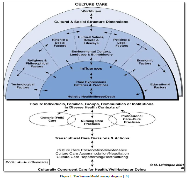 Culture includes the values, beliefs, behaviors, rules, customs and traditions, lifestyle and practices of a particular society that are learned and passed on from generation to generation. According to Madeleine Leininger, the founder of intercultural nursing, culture; It is the accumulation of knowledge about values, beliefs, roles and lifestyles that is learned and passed on to generations [9]. Leininger, the founder of transcultural nursing, defines transcultural nursing as a field of nursing that reveals scientific and humanist knowledge, puts this knowledge into use in the fields of "special-culture" and "universal-culture", focuses on health-disease care, a subculture that respects beliefs and values, and comparative research and analysis of different cultures [10]. Culturally sensitive nursing practices include identifying cultural needs, understanding the cultural connections of families and individuals in order to provide care without affecting the family's cultural belief system, and using emotional strategies to help caregivers and recipients achieve mutual goals. Therapeutic relationship building, appropriate and responsive care, and treatment can begin with a transcultural nursing approach [11]. Nurses with different cultures also care for individuals, families and community groups with different cultural characteristics. Just as nursing care is affected by the cultural characteristics of the individual receiving care, the culture of the nurse also affects the care initiatives she plans [12]. By creating the 'sunrise' model, Leininger talked about the necessity of cultural care in nursing care, created a theoretical method that guides studies on cultural health beliefs, and developed standard principles for nursing. These factors in Leininger's Sunrise Model are listed as the individual's worldview, kinship and social factors, cultural values, beliefs and lifestyles, religious/spiritual/philosophical factors, technological factors, economic factors, political and legal factors, educational factors, language and communication factors, emic and ethical care beliefs and practices, and general and specific nursing care factors [13,14] (Figure 1).