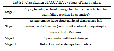 Heart failure (HF) is a clinical condition caused by cardiac structural and functional anomalies, accompanied by typical symptoms such as shortness of breath, fatigue, and edema as a result of low cardiac output and/or high intracranial pressure during rest or exercise. Some findings include increased jugular venous pressure, pulmonary rales, and peripheral edema [1]. The American Heart Association (AHA) estimates that a 46% increase in heart failure is expected from 2012 to 2030. It predicts that by 2030, more than 8 million people in the 18 and over age group in the USA will have heart failure. In our country, the HAPPY study conducted in 2012 (Research on Prevalence and Determinants of Heart Failure in Turkey) determined that there is a patient population of over two million [2,3]. There are many causes in the etiology of heart failure, such as valve diseases, congenital heart diseases, pulmonary diseases, connective tissue diseases, and infections. For its diagnosis, it is necessary to have physical examination findings and objective results of structural or functional disorders, along with typical symptoms. According to the Heart Failure Staging of the American College of Cardiology/American Heart Association (ACC/AHA), heart failure patients are examined in four stages, with the first two stages (A and B) being asymptomatic and at risk for the development of heart failure, while stages C and D include symptomatic heart failure patients (Table 1) [4].
