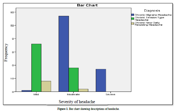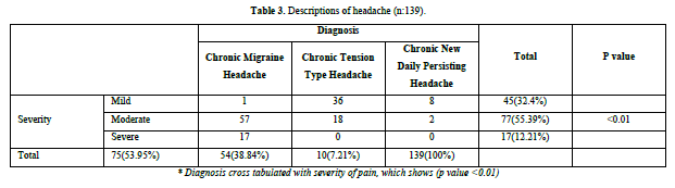 Among 139 CH patients, chronic migraine headache was commonest type of headache (53.95%). More than half of patients (55.39%) reported moderate severity of pain. Only (12.2%) had severe pain (Figure 1 & Table 3). The mean frequency of headache per month was (17.39 ± 4.18). The mean duration of headache in years was (5.36 ± 4.79).