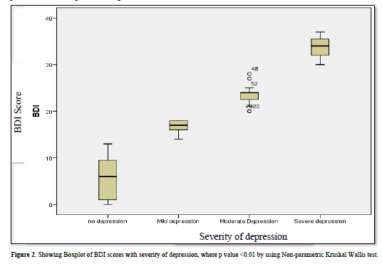 Statistical analysis: The data obtained from each participant was recorded in the proforma sheet and the data was entered into Microsoft Excel sheet and transferred into Statistical Package for Social Science (SPSS) - 11.5 versions. The analysis of the data was done in SPSS. For Descriptive statistics was completed with frequency, percentage, proportion, mean, standard deviation, inter-quartile range. For graphical representation bar diagram, boxplot, scatter line was constructed. Non-parametric kruskal wallis test and Chi square test was used to find out association between two categorical variables where p value was considered significant as 0.05. ANOVA test, Pearson correlation test was used to compare the mean to find out the QOL and to determine the correlation between depression and QOL, where p value was considered significant as 0.01. Ethical clearance was obtained from the Institutional ethical review board of BPKIHS.
