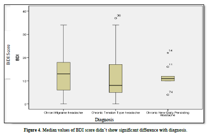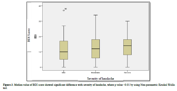 Limitations of the study: The BDI is screening tool, used for screening in suspected depression carrier, further work up is needed to diagnose depression. We cannot rule out the possibility of recall bias of the patient reported information. Patient was selected as convenience sampling technique, after being diagnosed as chronic primary headache. This sample may not be totally inclusive of all diagnostic categories. The current study was based exclusively on hospital-based outpatient sample therefore, may not be the representative sample of patients in the community.