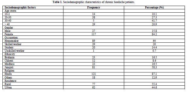 A total of 139 chronic headache patients visiting the general practice out patient’s department from September 2017 to September 2018 at B.P. Koirala Institute of Health Sciences were included in the study. Sociodemographic characteristics of chronic headache patients.