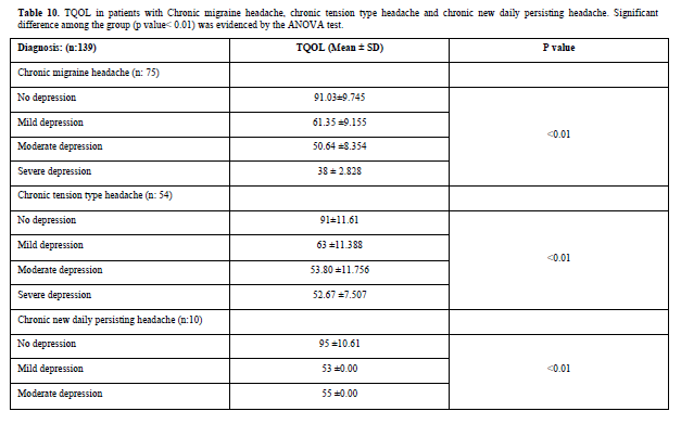 Mean of TQOL score were higher in the group with chronic migraine headache with no depression patients in comparison to the groups with mild to severe depression (Table 10).