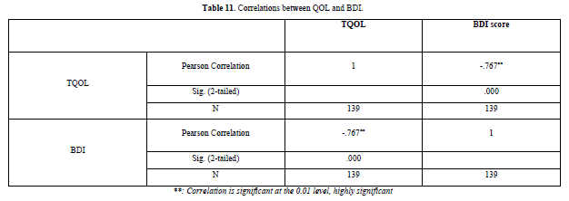 There were significant correlations between QOL and BDI, evidenced by Pearson correlations test (P value < 0.01) (Table 11 & Figure 5).