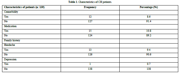 Among 139 CH patients, hypertension and hypothyroidism were found as a comorbidity. (5.7%) were on Antihypertensive, (2.8%) were on Thyroxine, and (2.3%) were under Antidepressive. Family history of headache was present in (9.4%). Family history of depression was present in (0.7%) (Table 2).