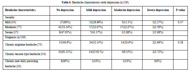 Severity of depression cross tabulated with severity of headache and diagnosis, did not show statistical significance (P value calculated by Pearson chi-square).