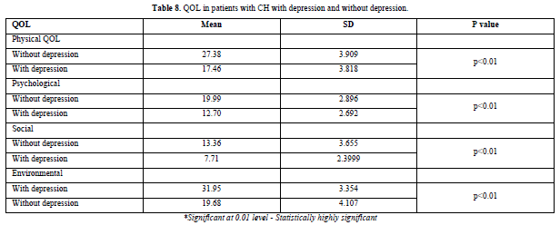 Mean QOL score were higher in the group without depression patients in comparison to the groups with depression. Significant difference among the group (p value< 0.01) was evidenced by the independent samples T- test (Table 8).