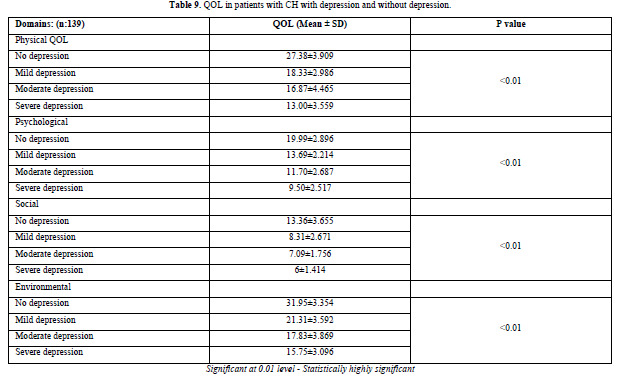 Mean QOL score were higher in the group with no depression patients in comparison to the groups with mild to severe depression. Significant difference among the group (p value < 0.01) was evidenced by the ANOVA test (Table 9).