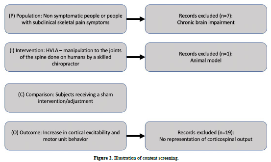 Trials conducted no earlier than 2010 and which underwent a peer-review process were further examined. To make sure that improvements occurred on the cortical level of the neuroaxis, only trials that proceeded by implementing a technology or diagnostic process that allowed for conclusions about corticospinal activity were included. Extensive reactions to the intervention had to be possible, so trials were excluded that focused on stroke patients, as well as those with any kind of permanent damage to the brain or a neurodegenerative disease. Chiropractic is a field that consists of different techniques and approaches. Manual manipulation has been researched for its requirements and impacts [20]. Therefore, approaches like tool-assisted chiropractic were not included. Also, any type of animal research on the topic has not been taken into consideration (Figures 1 & 2).