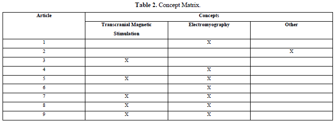 In the end, nine papers fulfilled the set criteria. The authors provided insights in cortical activity by specifically modified use of transcranial magnetic stimulation (TMS) and electromyography (EMG). One report featured bite force measurements, working on the hypothesis that central effects of care must be measurable in cranial nerve-innervated muscles (Tables 1 & 2).