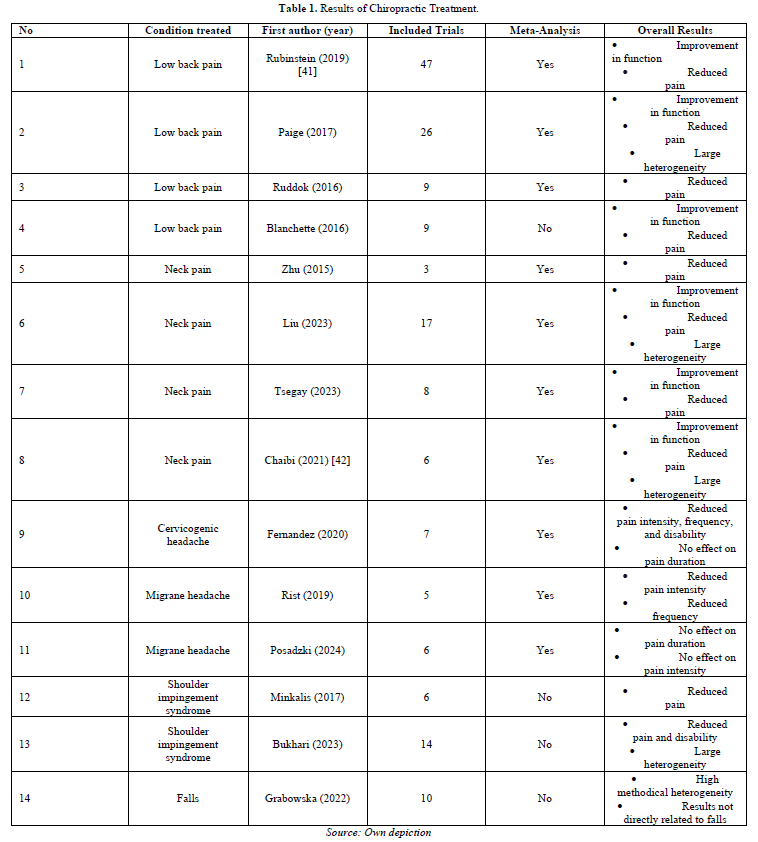 In light of the public's perception of chiropractors as specialists in back, neck, and skeletal pain, it is imperative to determine the validity of this professional designation in terms of its practical effectiveness. Specifically, it is necessary to ascertain whether there is a discrepancy between the public's perception of chiropractic services and the scientific consensus regarding their efficacy. To achieve this, a comprehensive literature search was conducted in the PubMed and Dimensions databases. This investigation focused on systematic reviews, with the aim of determining the effectiveness of chiropractic and spinal manipulation in the context of the most significant and stressful forms of illness that currently exist. The following criteria were established for the determination of eligibility: Studies must have been published no more than ten years prior to the present date, and they must have focused on high-velocity low-amplitude (HVLA) techniques as a therapeutic modality. Consequently, spinal manipulation and chiropractic served as search terms, each combined with one of the 25 most prevalent clinical pictures for years lived with disability [40]. Manual therapy, osteopathy, and related terms were excluded due to the broad spectrum of approaches they encompass. The results of the studies documented in the included reviews indicate that low back and neck pain are at the core of chiropractic practice. The evidence in these areas is sufficiently comprehensive and strong to allow cautious conclusions to be drawn about the potential beneficial effects of chiropractic care. Efficacy has been demonstrated by the reduction of pain and improvement of function in patients who have undergone the procedure. The prevalence of satisfactory responses to headache disorders and other skeletal disorders has been documented, although the evidence for these observations is less conclusive. The outcomes associated with these conditions are characterized by a greater degree of heterogeneity than those observed for back problems. A review was conducted to analyze the effects of chiropractic care on the incidence of falls. The analysis was primarily concerned with factors that have purely hypothetical effects on the frequency and severity of falls (Table 1).
