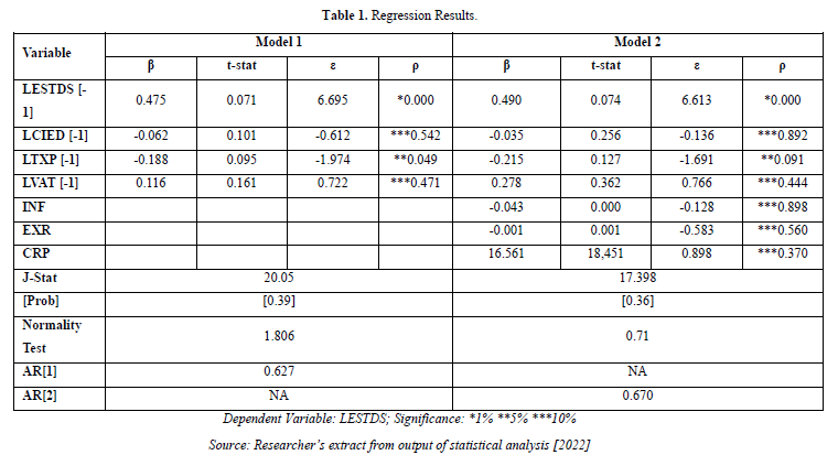 With the value of J-Statistics being 17.398 and its ρ-value stood at 0.36 which is greater than the chosen significant level of 10%: the model is confirmed valid exhaustive. Equally, evidenced from the probabilities of each of the measures of the explanatory variable which are all higher than the chosen significance level of 10%. Evaluating the significance of the impact of the individual variables; therefore, this study maintained that LCIED, LTXP, LVAT, INF, EXR and CRP positively but insignificantly affected LESTDS of SSA countries.