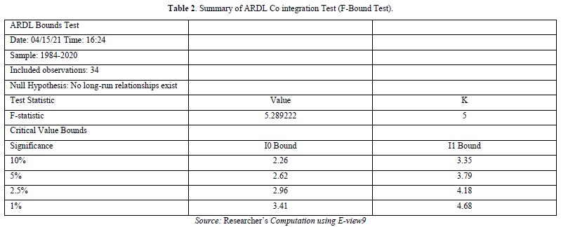 The ARDL F-bound test and its critical value at the 5% level of significance will be the basis for the f-test decision. If the f-bound test exceeds the upper bound at the 5% level of significance, Ho will be rejected.