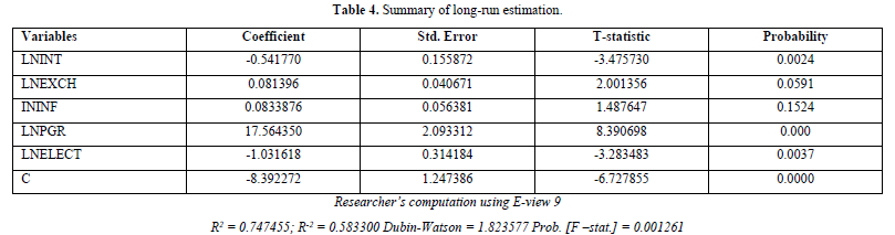 The existence of long-run relationship between the dependent variable and the independent variables informs the need to estimate both the long-run and short- run versions of our model. The long-run estimates are evaluated based on the following criteria (Tables 4 & 5).
