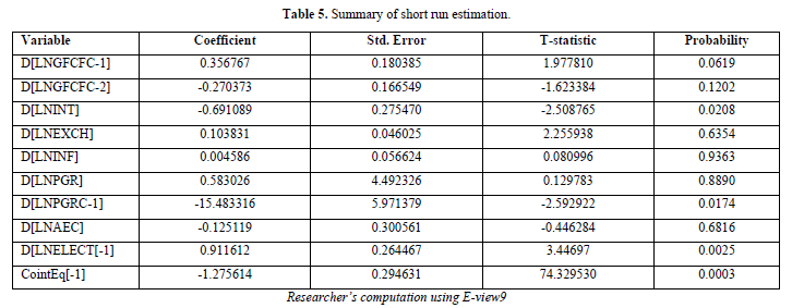 The result shows that there is a long-term association between the variables because the F-statistics is bigger than the upper bound at a 5% level of significance. We then estimate an error correction model to take into consideration the short run dynamics of the models given the long run relationship between the variables in each model. We first estimate the unrestricted ARDL model, where each variable is permitted to enter the model at a given lag length, before estimating the short run version of our model (Table 3).