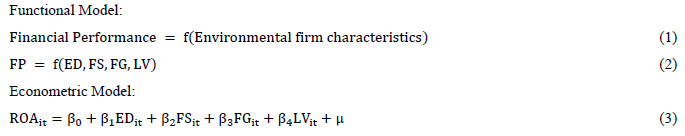 Where: ROA: Return on Assets; ED: Environmental Disclosure; FS: Firm Size; FG: Firm Growth; LV: Leverage; β0: Constant; β1-β4: Coefficient; i: Cross section; t: Time series; µ: Stochastic error term