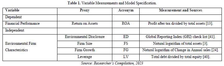 In order to test for the relevance of the hypotheses regarding the effect of Environmental firm Characteristics and financial performance of listed oil and gas companies on the Nigerian Exchange Group (NGX). This study adapted the model of Geerts, Dooms and Stas [42]: