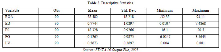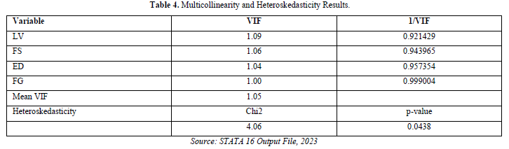 The result in Table 3 showed that FS has a negative but moderate association with ROA which is statistically significant at 1%. Also, ED and FG were found to have a positive but weak association with ROA which are not statistically significant. On the issue of Multicollinearity, the highest coefficient is -0.2237 between LV and FS. This is less than 0.80. Thus, indicating that, there is no Multicollinearity among the independent variables of the study. However, a formal Multicollinearity test was conducted to further confirm the absence of Multicollinearity.