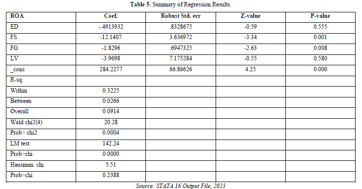 Table 5 showed the summary of regression results as generated from the panel data of the study. The overall statistical significance of the model can be assessed by the coefficient of determination. The overall R-sq value of 0.0914 represents the predictive power of the model. In indicates that, about 9% variation in financial performance measured by ROA of listed oil and gas companies in Nigeria can be jointly explained by Environmental Disclosure (ED), Firm Size (FS), Firm Growth (FG) and Leverage (LEV). This means that, the remaining 91% is explained by variables not employed in this study. In addition, the combined effect of a significant p-value of 0.0004 and Wald chi of 20.28 suggests that the model is fit hence interpreted to explain the relationship between environmental firm characteristics and financial performance of listed oil and gas companies in Nigeria. Furthermore, selecting the appropriate model requires some post estimation tests to be conducted. Hence, the Langragian Multiplier (LM) Test for panel effect was conducted. The results showed that, there is no panel effect in the model. This is because the p-value of the LM test of 0.0000 was statistically significant at 1% as desired. In addition, the Hausman Specification test was used to decide between the fixed and random effect models, which is appropriate. The result of the test revealed that, the random effect model (REM) is most suitable for the study.